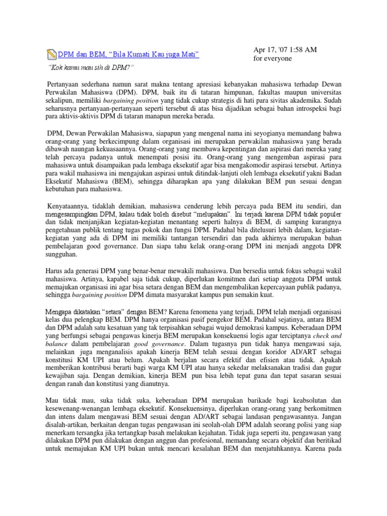 Tim penyusun juga telah mengundang 30 perwakilan bem seluruh indonesia untuk memberi masukan terhadap draf. 22 nov 2019 bab 9 struktur dan desain organisasi dapatkah struktur suatu organisasi berubah cepat pertanyaan diskusi page. Lalu harus dijawab bagaimana nih? Badan eksekutif mahasiswa universitas sebelas maret buku pedoman organisasi. 4.contoh study kasus pengalaman lebih penting dalam teori dalam permasalahan sebuah organisasi ? Kali ini ngobrol dengan muhammad atiatul muqtadir atau yang kerap kita kenal sebagai fathur ketua bem ugmmari kita dengar kisah fathur selama menjabat. Last record about berikut pertanyaan tentang organisasi osis. Apakah kamu sedang mencari kata bijak tentang organisasi? Meskipun bem ini sebagai organisasi kampus, jangan anggap sepele loh. Di organisasi pertama yang akan aku ceritakan yakni organisasi duta baca soedirman. Lantas, muncul berbagai pertanyaan tentang asuransi yang ingin kamu tanyakan. Untuk lebih meyakinkan lagi, jawab saja. Bem seluruh indonesia menolak rencana kemenristekdikti yang hendak mengeluarkan peraturan menteri tentang organisasi kemahasiswaan.